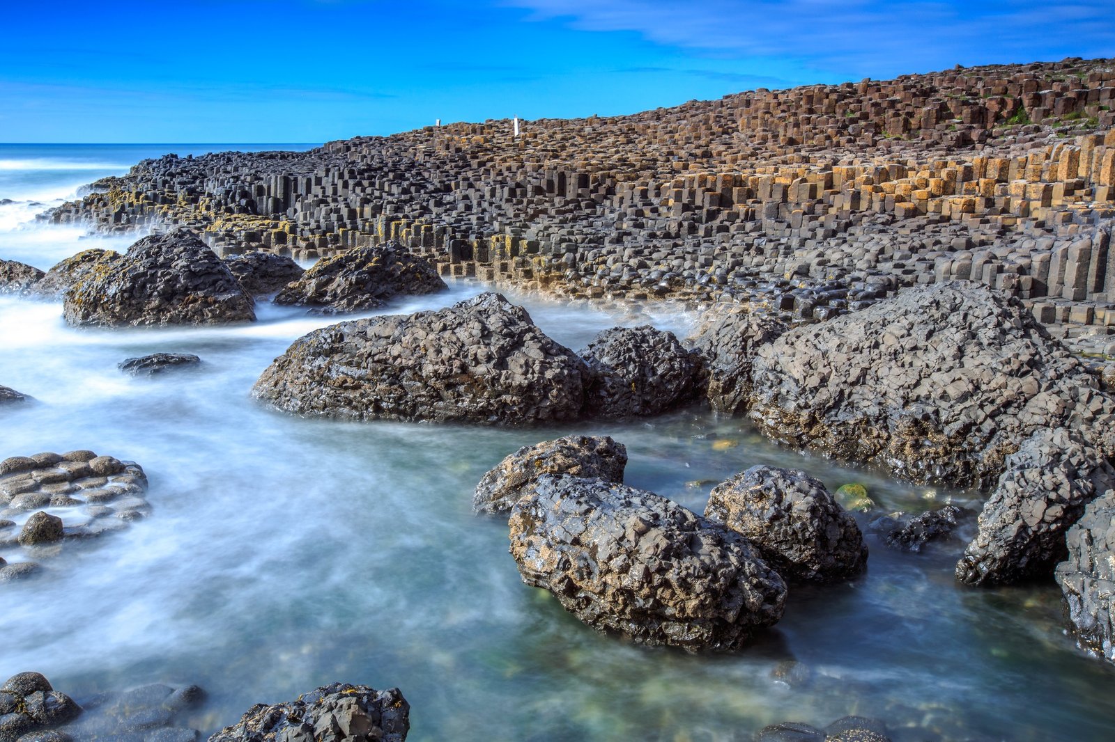 Cuenta con, aproximadamente, 40.000 columnas de basalto y cada una de ellas suele tener entre cinco y seis lados, que sobresalen de las caras del acantilado como si fueran escalones que se adentran en el mar. Durante millones de años se han mantenido como una muralla natural contra la ferocidad de las tormentas del Atlántico Norte.