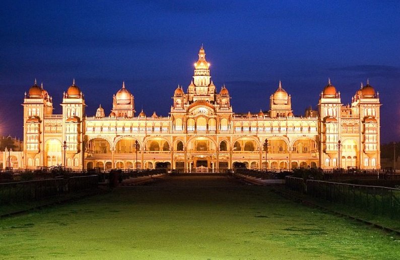 Cúpulas de mármol rosa intenso, arcos delicadamente elaborados, esculturas de diosas hindúes y una torre de cinco pisos distinguen esta magnífica sede real de los maharajás de Mysore, que se ilumina durante el festival de Dussehra cada otoño con más de 96.000 luces.