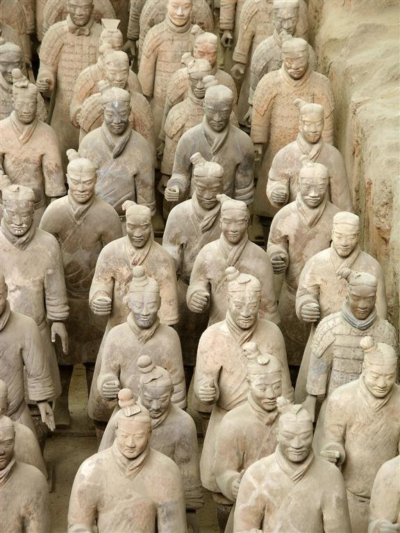 Unos 700.000 obreros fabricaron más de 7.000 guerreros de terracota de tamaño real, cada uno de ellos coloreado con pigmentos brillantes (aunque los colores no se conservan hoy en día, se están desarrollando técnicas para recrearlos) y llevando una ballesta, una lanza o una espada de madera y metal.