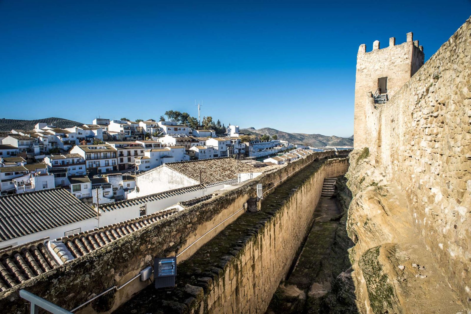 Iznájar se sitúa sobre un cerro que domina el embalse más grande de Andalucía, construido en 1969. Con 32 km² de superficie, creó un litoral interior único, diferenciándolo visualmente de otros pueblos de Andalucía de sierra. Además, su castillo de origen árabe data del siglo VIII, aunque fue reformado en etapas cristianas posteriores. También, la Torre del Homenaje vigila el pueblo con un perfil reconocible.
