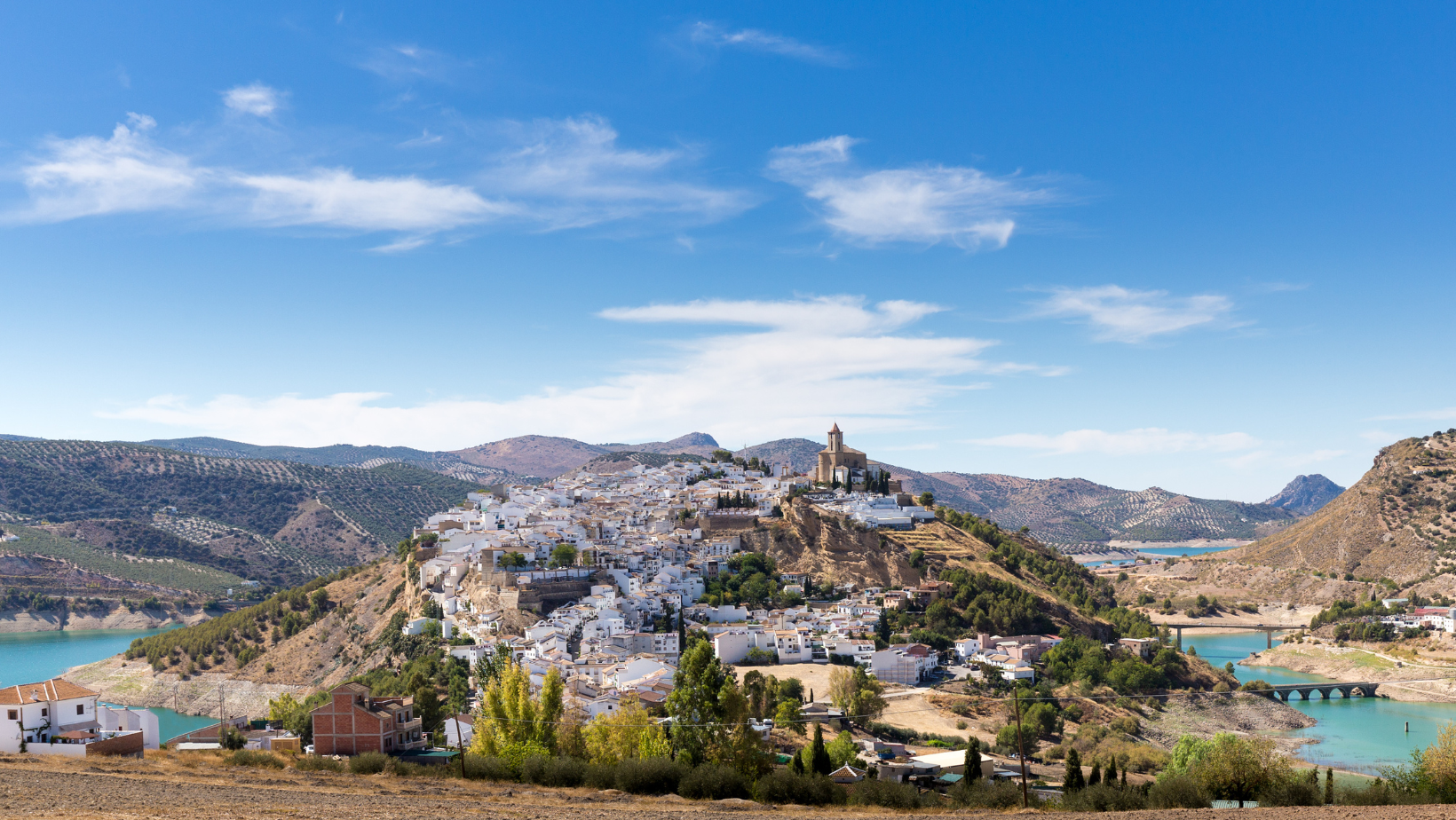 Iznájar se sitúa sobre un cerro que domina el embalse más grande de Andalucía, construido en 1969. Con 32 km² de superficie, creó un litoral interior único, diferenciándolo visualmente de otros pueblos de Andalucía de sierra. Además, su castillo de origen árabe data del siglo VIII, aunque fue reformado en etapas cristianas posteriores. También, la Torre del Homenaje vigila el pueblo con un perfil reconocible.