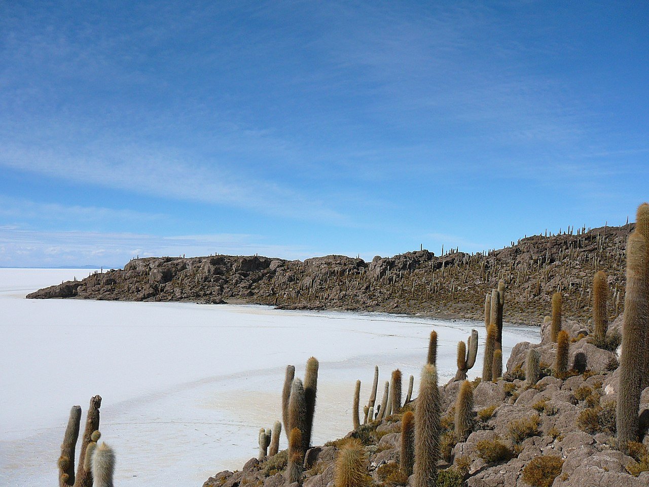 La luz llena el cielo y rebota en la superficie brillante del lago salado. Si la visita se realiza en el momento adecuado, una capa superficial de agua de lluvia, que se evapora de nuevo en verano, se traduce en un brillo perfectamente reflectante que hace de espejo del cielo. El aire fresco de las alturas (3.653 metros) del Altiplano es tan puro como el paisaje. Hay poca vegetación, excepto los altos cactus espinosos de crecimiento lento de la isla, y no hay mucha vida silvestre, aparte de las vicuñas y llamas extraviadas o los flamencos rosados que se alimentan cerca de la orilla.